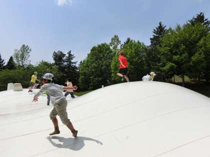 グループでのオリエンテーリングでは、チェックポイントで出されるクイズやゲームをクリアしながら進みました。