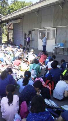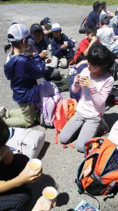 宮田果樹園に着きました。果樹園の方から、川場村やリンゴができるまでについてお話をうかがいました。そのあと、おいしいリンゴジュースをいただきました。