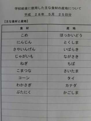 5月25日の給食食材産地