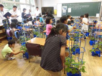 育てているアサガオに支柱を立てようという作戦を立てた1年生。今日は、支柱を立てる前と比べてツルがどのように変わったか。どのように巻きついたかをよく観察しました。
