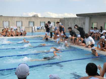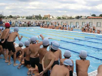 全員が選手として泳ぎ、記録を計測しました。どの子も6年間の水泳学習でつけた泳力を存分に発揮しました。