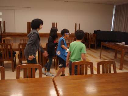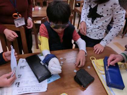 実際に体が動きにくくなる装具をつけて歩行体験をしたり、視野が限定されるゴーグルを着用し小銭の勘定をしたりしました。