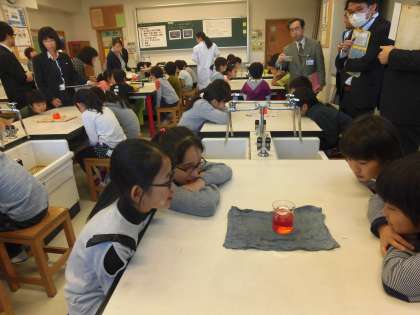 水を熱したり冷やしたりするときに起こる変化について、既習事項を活用した実験を行い、現象を説明する活動を通して、考察する力を伸ばすことをねらいとした授業でした。