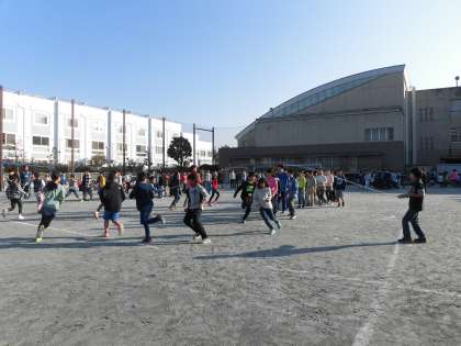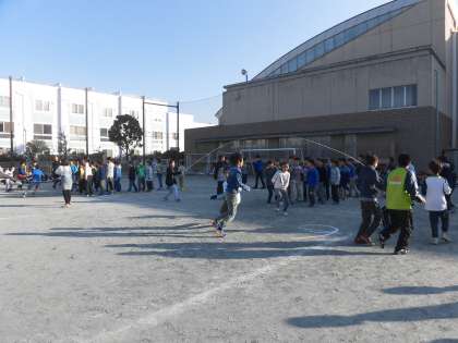 本日の朝の活動は体育朝会でした。クラスごとに長縄跳びを行いました。