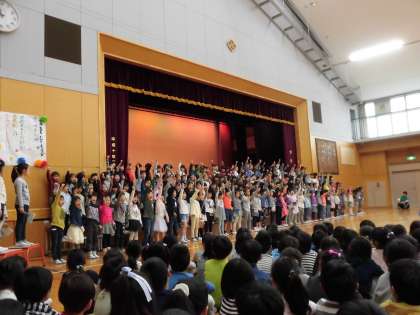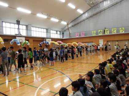 1年生は、花のアーチの中を6年生と手をつないで入場しました。2年生から6年生までの人数の多さにびっくりしていました。