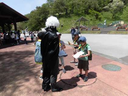 青空の下、子ども達はグループごとにスタンプラリーを行い、各ポイントで仮装した先生達を見つけ出し、スタンプを集めました。