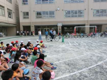 自転車も自動車と同じで、乗るときには標識に従って運転しなければいけないことを教えていただきました。また、実際に自転車に乗り、ブレーキの掛け方や左右の確認の仕方を体験することができました。