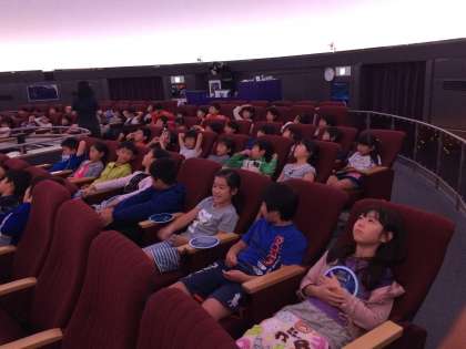 第二部では、プラネタリウムで月や星の動き方について学習しました。星座早見表を使い、夜空の星を見付けたり、月の満ち欠けと星の動きを学んだりしました。東京では見ることが難しい満天の星空を体験することができました。