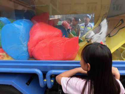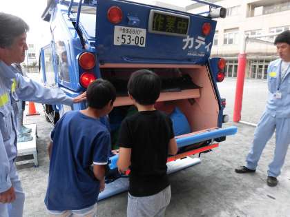 ごみ収集の様子を透視できるスケルトンカーや、普段触ることのできない、収集車や清掃作業着を試着させていただきました。再利用される過程のポリエステルなどにも触れる事ができました。学習を通してゴミを減らしていかなければならないと感じました。