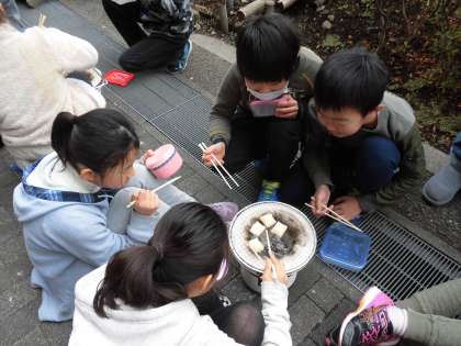 普段はトースターやグリルなどで焼いている餅を、七輪でじっくりと焼いたことで、子どもたちは「いつもよりおいしい!」と嬉しそうでした。また、「トースターだとタイマーが付いていてずっと見ていなくても良いけれど、七輪はきちんと見ていないと焦げてしまう。」と、今のくらしの便利さにも気付くことができました。