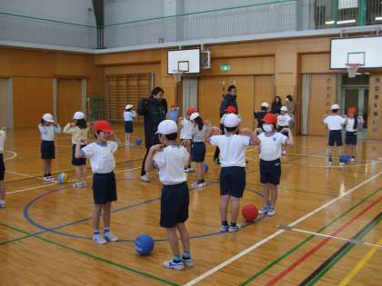 本日の午前は、東京ヴェルディよりゲストティーチャーをお迎えし、サッカー教室を行いました。ボールを使って2人1組で体をほぐした後、手つなぎあるいは一人の、3〜4個のボールを使ったゲームをしました。みんな夢中でボールを追いかけていました。最後は、声かけやコミュニケーションの大切さについて話をしていただきました。