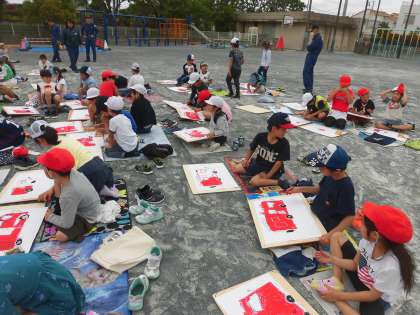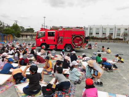 大きな消防車と消防士さんを画用紙いっぱいに描きました。本物をじっくり見て描くという貴重な体験ができました。