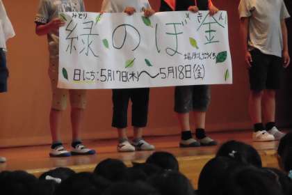今週の全校朝会で、栽培委員会の児童が全校児童に向けて緑の募金活動について呼び掛けをしました。
