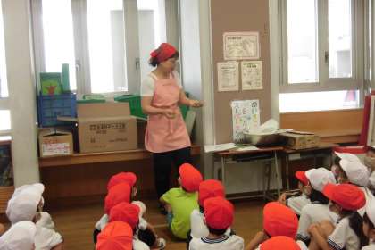 食育の一環として、栄養士の南先生に、さやの中がどうなっているのか、さやの大きさによって中に入っている豆の数が違うことなどを教わりました。豆やさやのにおいをかいだり豆の数を数えたりしながらさやむきをしました。