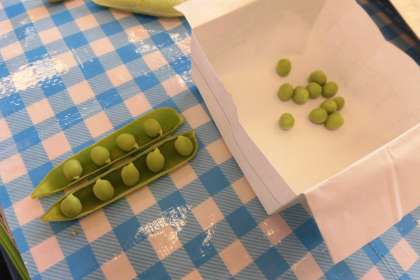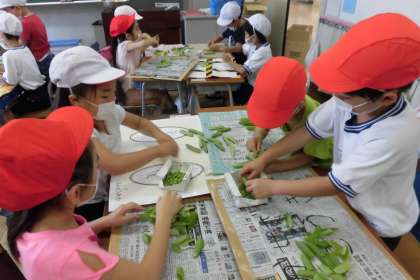 先週の水曜日、1年生が生活科の授業で、グリーンピースのさやむきをしました。
