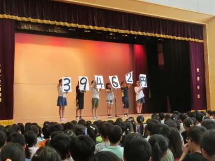 本日の朝会で、栽培委員会の代表児童が、先月の緑の募金の集計結果について報告しました。