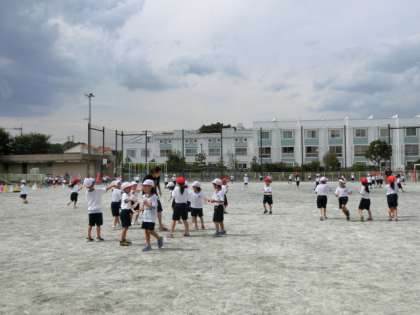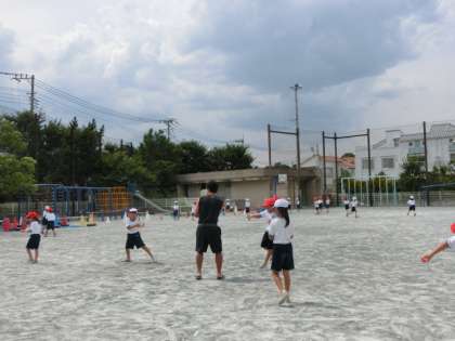 広い校庭を全部使って、遠くまで水を飛ばすにはどうしたらよいかを考えながら、友達と楽しんで水をかけあって遊びました。担任5人もびしょ濡れになりながら子どもたちと水をかけあいました。