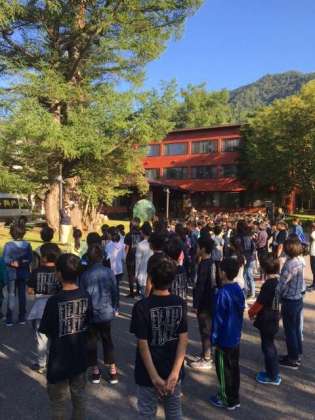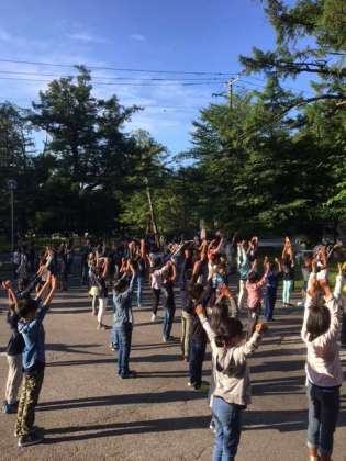 朝会では、今日のめあてを確認し、ラジオ体操を行いました。トンボがたくさんいて、びっくりしています。