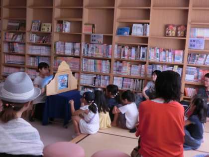 4日土曜日に、第2回おはなし会を行いました。図書ラウンジの奥の部屋を暗くし、不気味な音楽をかけながら妖怪やおばけの話の読み聞かせをしました。