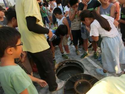 その後は、校庭に組立式のトイレを設置していただきました。子どもたちは井戸の水をポンプを押して流してみたり、トイレに座ったりするなどの体験をしました。