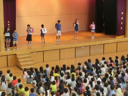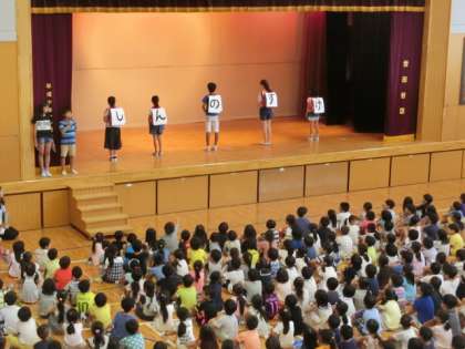 本日の朝の活動は、集会委員会による「1周回って文字当てクイズ」集会でした。
