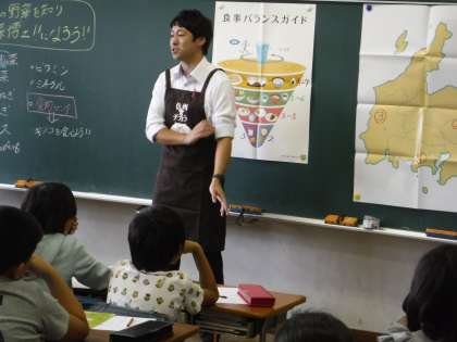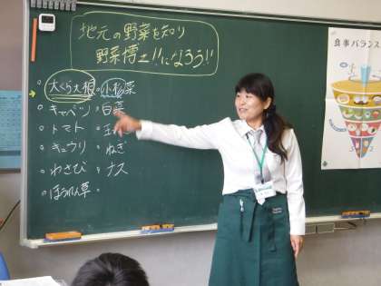 本日、5年生は総合的な学習の時間で、青果物健康推進協会のベジフルティーチャーをお招きした授業を行いました。