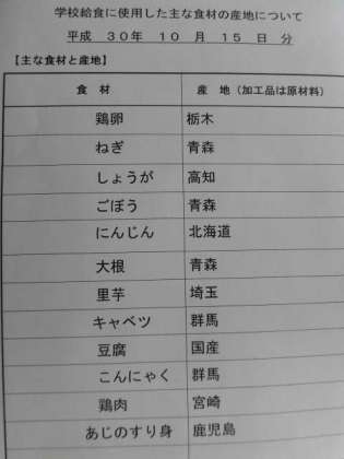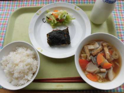 ○アジの山河焼き(千葉県の郷土料理です。漁師さんが、考えた料理といわれています。地元では「なめろう」といっているようです。アジや秋刀魚がたくさんとれるので、魚をすり身にして、ネギ、生姜、みそで味を付けます。給食では、鶏挽肉を加えて形を整えて、海苔を巻き、オーブンで焼きました。)