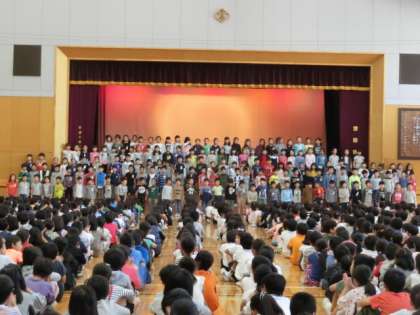 発表学年は1年生です。短歌「あかあかや」と、宮澤賢治さんの詩「あめにもまけず」を声を合わせて朗誦しました。長い詩をよく覚えて頑張りました。
