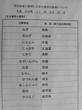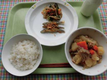 ○肉じゃが(じゃが芋は一人90g、中位のサイズで/2個使用しました。じゃが芋の原産地は南米です。日本には江戸時代にオランダ船に乗ってやってきたようです。今日は肉じゃがでいただきました。子どもたちにも親しまれているおかずのひとつです。)