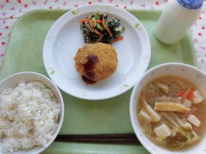 長崎県から「新じゃが」が入荷しました。今日はそのじゃが芋でポテトコロッケを作りました。少し黄色で瑞々しかったです。子どもたちからは「周りはサクサクしていて、中がしっとりしていて、すごくおいしかった!」の声が聞かれました。
