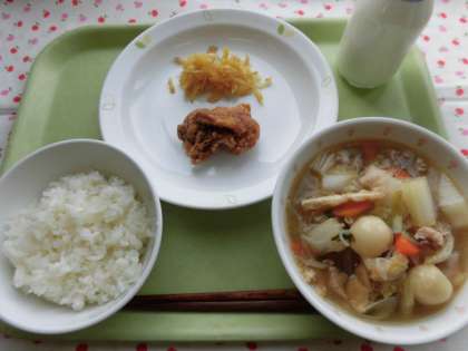 全国学校給食週間3日目の給食です。今日は秋田県の郷土料理からです。主食は「秋田こまちごはん」です。だまっこ鍋のだまっこはご飯をつぶして丸めて作りますが、給食では炊いたごはんと米粉、白玉粉を混ぜて作りました。だまっこは、きりたんぽのルーツと言われています。いぶりがっこは秋田県の名産です。冬に備えて、大根を燻製にして保存食として食べられていたようです。香ばしい香りは食欲をそそります。残はほとんどありませんでした。