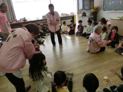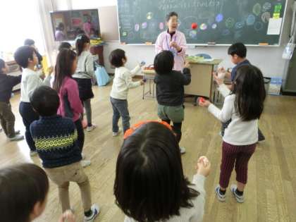 世界の国々で昔から遊ばれていたお手玉を見せてくださったり、歌いながら大勢でも遊べるやり方を教わったりしました。子どもたちは興味深く話を聞き、楽しく学習することができました。