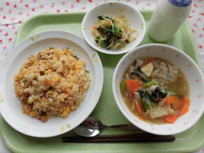 今日はキムチチャーハンを作りました。キムチは韓国で考えられた漬物ですが、材料の唐辛子は日本が原産地です。キムチという姿に変えて、逆輸入ということになります。日本でも人気です。給食では国産のキムチでチャーハンをいただきます。
