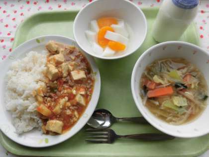 今日は中華料理です。春雨入りキャベツのスープに入る春雨は子どもたちに大人気です。春雨の原材料は緑豆、じゃが芋、さつま芋などの澱粉で作られているようです。春雨という名称は春の雨から名付けられたようです。