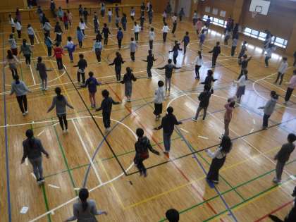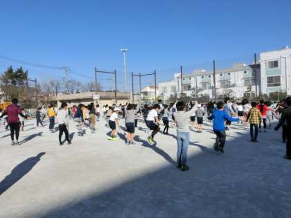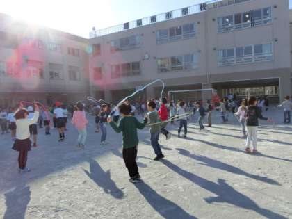 低学年と中学年は校庭で、高学年は体育館で行いました。全学年が、短縄跳びを使った運動を何種類か行いました。短縄跳びは、一人で狭いスペースでもできる体力向上に適した運動です。お家や近所の公園などで続けて練習するとさらに上達すると思います。