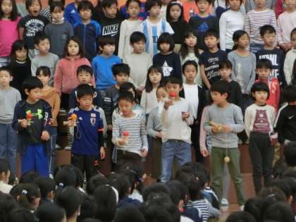 日本語の学習で取り組んできた昔遊び(けん玉、あやとり、ヨーヨー)の様々な技を代表児童が発表し、みんな釘付けでした。