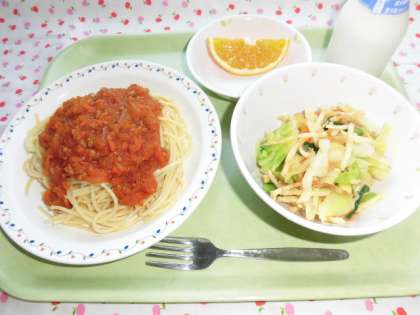 今日の給食は大人気のスパゲッティミートソースです。給食では豚挽肉20g玉ねぎ65gにんじん15g使います。みじん切りにしてよく炒めてトマト味にしてじっくり煮込みます。トロ〜りとした味に仕上がります。