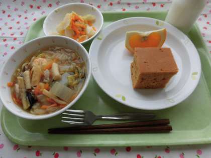 今日はオリパラメニュー、中国料理からです。中国の人口は13.9億人、日本の約14倍です。広東省は東側に位置しており、魚介類をいただくようです。とろみを付けて、五目ラーメン、広東めんと名付けたのは日本人だそうです。マーラーカオはマレーシア料理に見習った広東省の蒸しパンです。ラーパーツアイは白菜と大根をラー油、酢で漬け込みました。