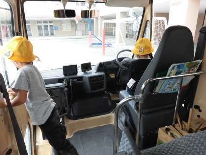 一人一人横断歩道を渡る練習をしたり、トラックの運転席に座らせていただいて、運転席から見ると死角が多く、見えないところがたくさんあることを知ったりしました。