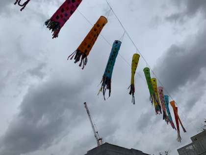 毎年恒例の鯉のぼりの掲揚が始まりました。砧南小と児童館の間をたくさんの鯉のぼりが泳いでいます。本校の1、2年生の子どもたちと保護者の皆さんによる手作り鯉のぼりです。鎌田児童館の皆さんとパパースの皆さんに揚げていただいています。次は、5日こどもの日に揚がります。青空になるといいですね。