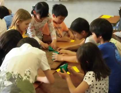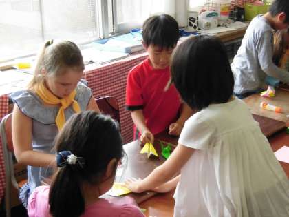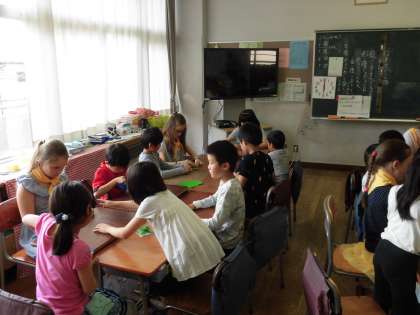 5月10日金曜日にロシアより26名の児童・生徒と9名の引率者を迎えました。各クラス5名から6名に分かれ、5時間目に交流をしました。折り紙で鶴やメダルなどを作り、日本の折り紙遊びを体験してもらいました。言葉は通じませんが、遊びを通じて身振り手振りで表現し、互いに楽しい時間を過ごしました。その後は校内巡りをしてもらいました。