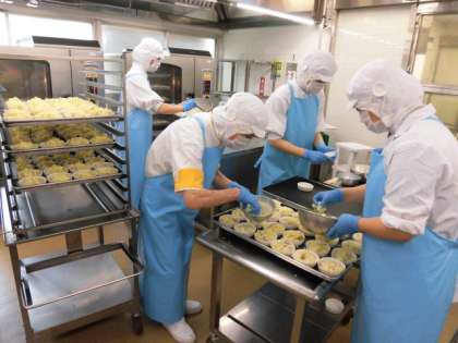 今日はポテトグラタンです。ポテトは一度蒸して、炒めた鶏肉、玉ねぎ、マッシュルームに牛乳、生クリームを加えて作ります。チーズ、パン粉をのせてオーブンで焼きます。