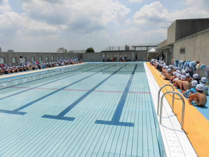 小学校初めてのプール、「大きくてびっくりした。」「冷たくて気持ち良かった。」「もぐれて楽しかった。」と、楽しんでいました。