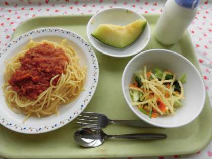 今日はスパゲティミートソースです。豚挽肉は20g玉ねぎ、にんじん、セロリー、トマトなど110g入っています。じっくり煮込み、チーズも入りますので、コクのあるソースとなります。パスタにかけていただきます。