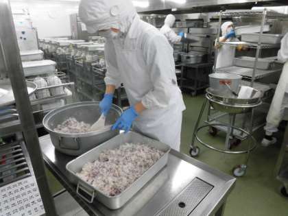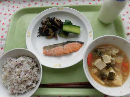 今日の主食はゆかりごはんです。ゆかりは赤ジソを乾燥させて、粉末にして作ります。ゆかりという名称はあるふりかけメーカーの人が名付けたそうです。古今和歌集で愛おしい紫色の植物と赤ジソの紫、そこから「縁」(ゆかり)と、名付けられたとか、、、。食欲をそそる一品です。