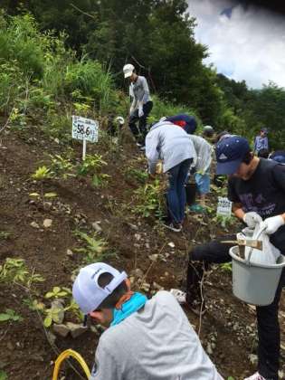 「コナラ」「ハナミズキ」のどちらか1本を植えました。もっていった校名の入ったプレートも近くに設置しました。