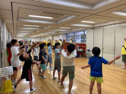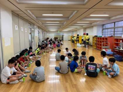 おはようございます。朝になりました。子どもたちは夜遅くまでおきていたようで、皆眠そうです。皆でラジオ体操をして体を動かし、目を覚ましました。ラジオ体操の後は、朝食タイムです。