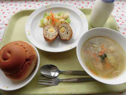 スコッチエッグはうずら卵を使用しました。ブロスとはスープのことです。肉、野菜、豆、大麦を入れています。体温まる一品です。子どもたちは大変よく食べていました。