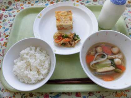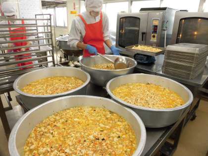 擬製豆腐は精進料理の一つです。崩した豆腐と椎茸、にんじんなどの野菜をみじんにし、炒めて味付け後、液卵を混ぜ合わせてスチームコベクションで焼きます。とても手の込んだ料理です。写真は擬製豆腐の具を天板に入れているところです。