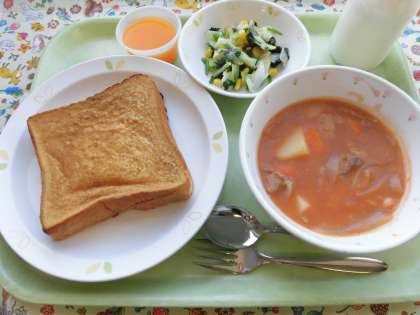 きな粉豆乳トーストは、卵、牛乳アレルギーの人に考えられたメニューです。好評に付き、普通の給食メニューとして登場しています。